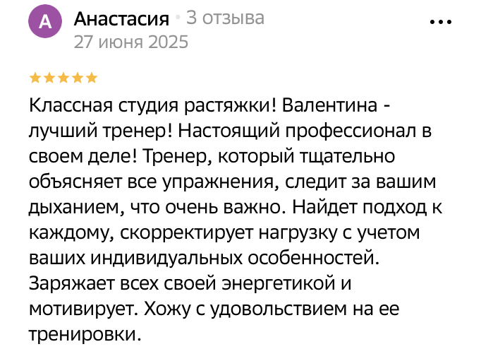 Ваше мнение очень важно для нас! Мы ценим ваш отзыв и хотим узнать, что вы думаете о нашей студии растяжки в Чите. Ваши отзывы помогают нам улучшать наши услуги и обеспечивать ваш комфорт.